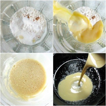 Lightly grease a 9" cast iron skillet, or 8" round cake pan. The size of the pan matters here, so measure carefully. Too small, it'll overflow. Too large, it won't puff as high. If you're using a cast iron skillet, it should measure 9" across the top; its bottom diameter will be smaller.
