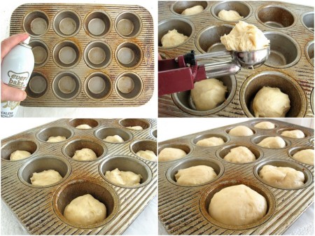 If you don't have two muffin pans (or want to make a loaf, in addition to rolls), lightly grease one muffin pan, plus a 6" soufflé dish or other round, bakeable dish or small loaf pan.