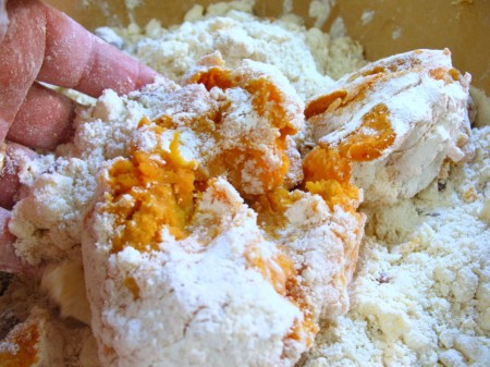 Mix in 1 1/2 cups (379g) mashed sweet potato and 6 tablespoons (85g) milk at low speed until you have a moist, cohesive dough. If needed, add another tablespoon or two of milk to bring the dough together.