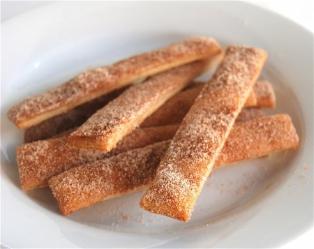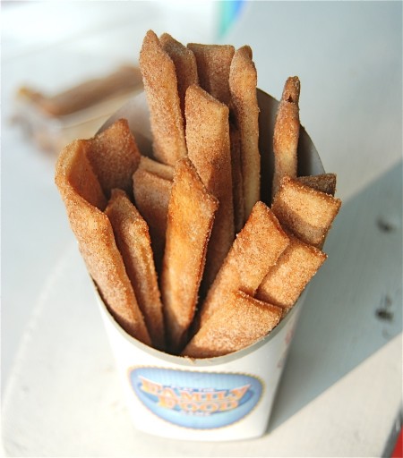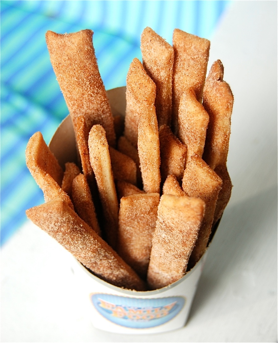 Riffing on an idea from a blog he read, Homrighausen cuts pie crust dough in even strips, brushes with butter, sprinkles with cinnamon-sugar, bakes, and serves the "fries" in little french fry bags, just like you'd get at your local fast food joint.