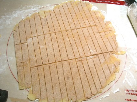 Roll pie dough 1/8" to 1/4" thick. Here I've rolled out half of my favorite pie crust recipe; I'd used the other half for raspberry tarts, and had this piece in the freezer.