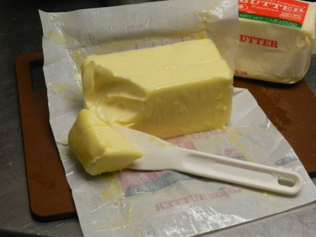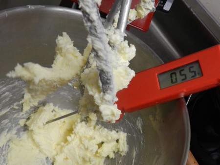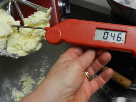 Hmm. Too hot to add to the frosting, or it will melt. Looking around, I realized there was no more room temperature butter around the kitchen. So I took what I needed, chopped it in chunks, and started beating it in my mixer to soften it. After a bit of this, I tried its temperature, too.