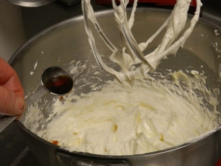 Once one chunk is taken up, add the next, until half the butter is in the bowl. At this point, it's a good idea to stop and scrape the sides and bottom; there's usually some meringue that's reluctant to mix in evenly. Add the rest of the butter, then the flavoring of your choice. I've got vanilla going on here, but let's talk about where else you can go.