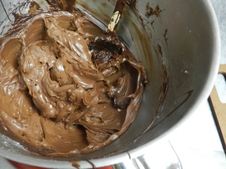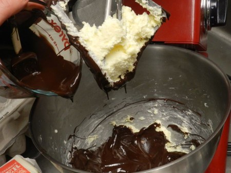 OK, so with the butter at 55 and the chocolate at 95 or so, and their volumes being equal, I figured I should get the two together, and once mixed they'd end up someplace in the middle, which would be just right (around 75°) for adding to the frosting. Time to get these in the same bowl.