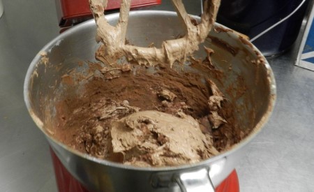 Kind of pale for you chocolate hounds, eh? Well, we're not quite done yet. At this point, it's time to go for the cocoa powder. I reached for our KAF All-Purpose Baking Cocoa, which is a blend of both natural and Dutch-processed cocoas; it's a nice balance of tang (good with all the butter) and dark, rich color.