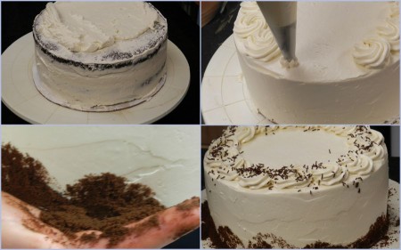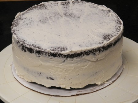 After this rest, the crumb coat should be set up. You'll know if you can touch the surface and your finger comes back totally clean. Now you can frost the cake as you like, and you won't be struggling with any part of the layers coming up or shifting around. This is where buttercream really shows its stuff, and is a joy to work with. Since I've put vanilla frosting on this chocolate cake, I want to give a hint that there's some chocolate inside, which is why I put the chocolate crumbs around the bottom and some chocolate sprinkles on top. Since there are cherries inside, it wouldn't be a bad idea to plop one or two on top for color, either.