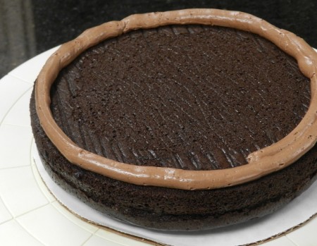 First step to frosting our cake: Make sure the layers are completely cool. Doesn't hurt to put them in the freezer for half an hour before working with them, either. Doing that will firm up the layers and make them easier to handle, less likely to shred or tear. If the layer isn't level, trim the top. If it is, put it top down on a cardboard cake circle. To keep the cake from having a bulge around the middle, put some buttercream in a piping bag, cut off the tip, and pipe a rope around the outside edge.