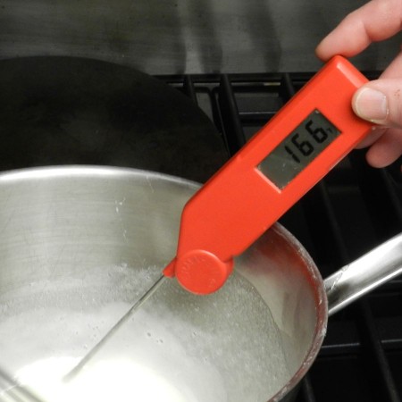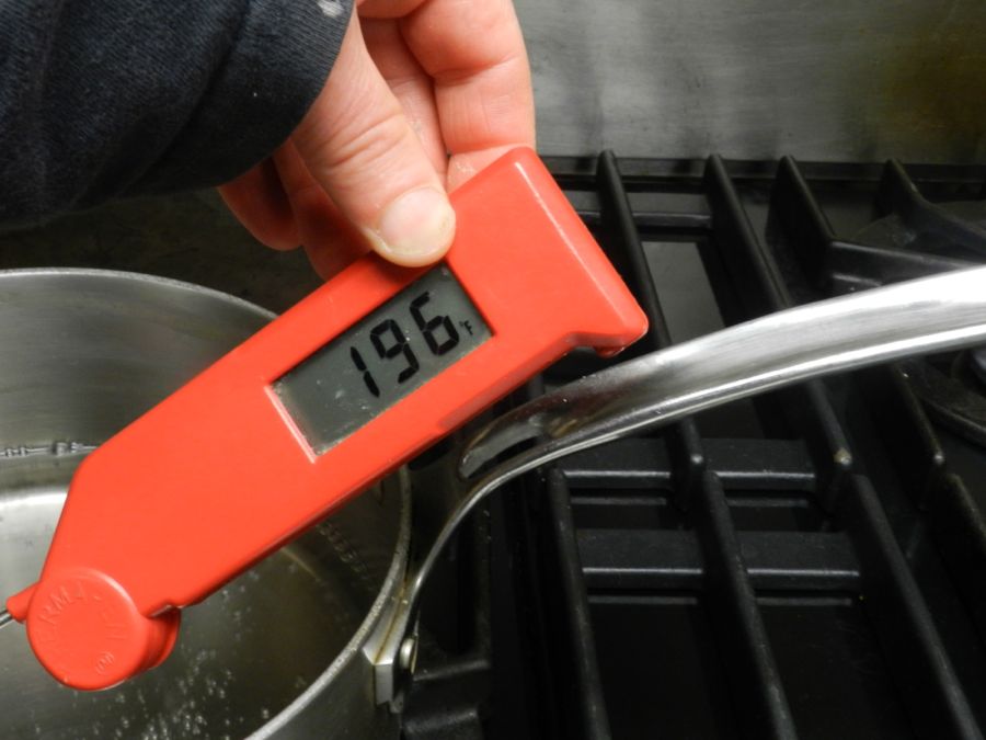 You don't need to get to 166° like you see here; that's just what happened as I was juggling whisk, bowl, camera, and thermapen until Frank came to my rescue.