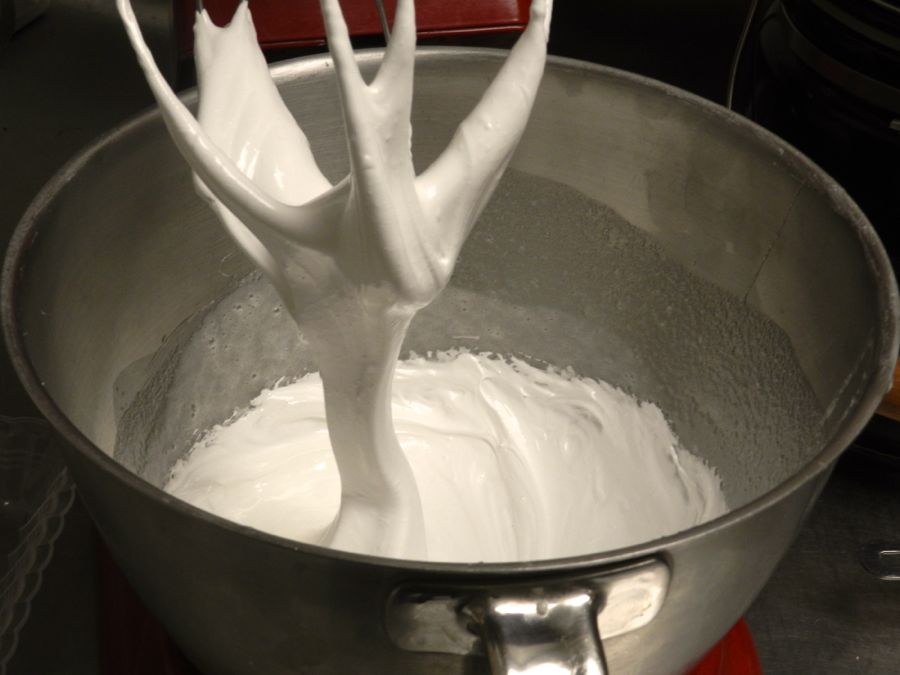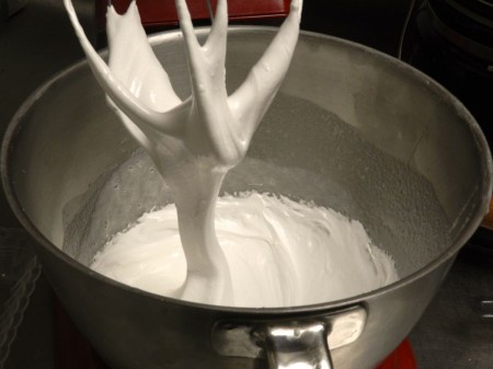 Beat the whites and sugar until stiff and taffy-like. Check it out.