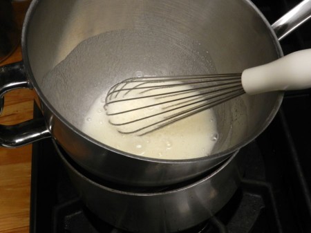 Which was a hair under the line when viewed from the side, but close enough for our purposes. Can you use powdered egg whites or meringue powder? Yes, you certainly can. Use 1/2 cup water and sprinkle 1/4 cup of meringue powder or dried egg whites on top. Whisk them together until the powder is moistened. Either way, add the whites to the sugar, and add the salt. Grab your whisk (if you truly hate washing dishes you can always use the whisk attachment from your mixer here and save yourself one item to clean) and head for the stove. How hot should the water be?