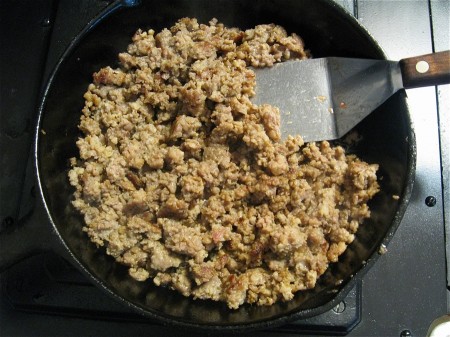 First step: Cook 1 pound of breakfast sausage until it's nice and brown. Transfer the cooked sausage to some paper towels to drain and cool, and pour off most of the fat, leaving just a sheen in the pan. Set the pan aside for now; you'll come back to it.
