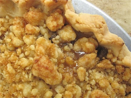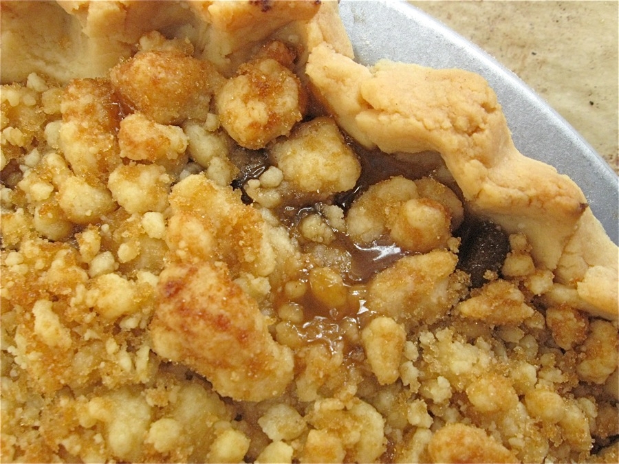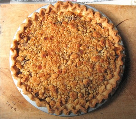 Remove the pie from the oven. Both crust and crumb topping should be golden brown.