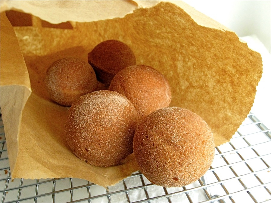 While the doughnuts are still warm (i.e., as each batch comes out of the oven), place 4 or 5 at a time in a paper bag with cinnamon-sugar. About 3 tablespoons cinnamon-sugar should be enough for the whole batch.