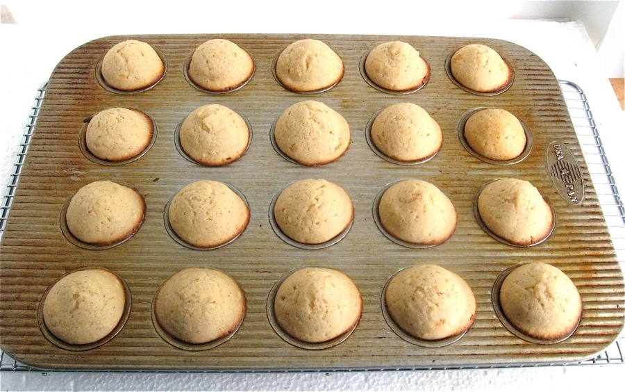 And here they are as mini muffins. If you've used a mini-muffin pan, bake in a preheated 425°F oven for about 10 minutes, until they test done; they won't be very brown, but a toothpick inserted into the center of once will come out clean.