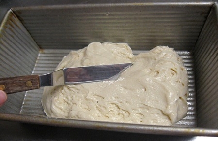 ...until you have three glorious layers. Cover with a final layer of bread batter, leaving the center in a domed shape and smoothing gently with wet fingers or a small offset spatula.