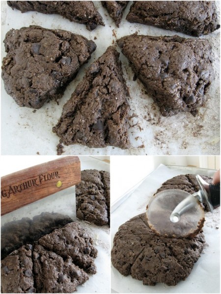Mix 3 tablespoons confectioners' sugar with 1 teaspoon cocoa powder, and sprinkle it on your parchment-lined (or lightly greased) baking sheet. You're using this sugar mixture in place of the usual flour, to keep the scones from sticking to the pan as you shape them.