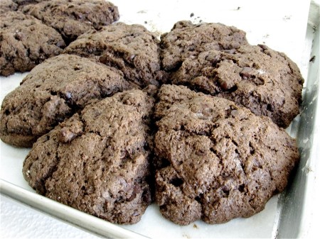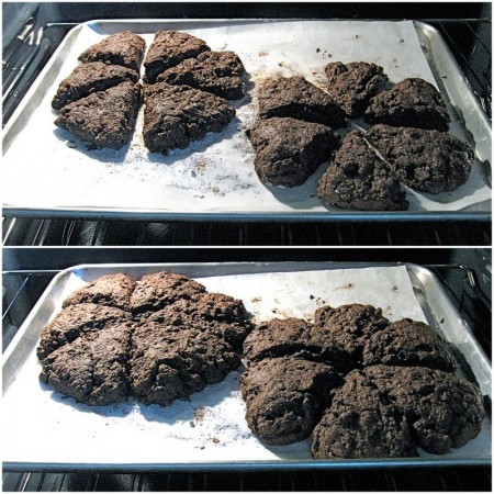 Bake the scones for 18 to 23 minutes, until they lose their moist look, and a cake tester inserted into the center of one comes out clean; or with just a smear of chocolate from a melting chip.