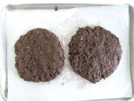 Divide the dough in half, and place the two pieces onto the baking sheet. Pat them gently into two 6" circles, each about 3/4" thick.