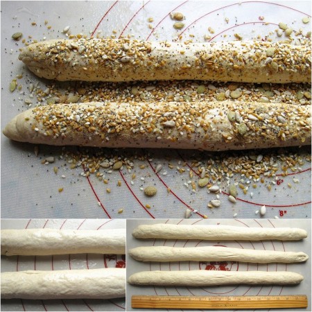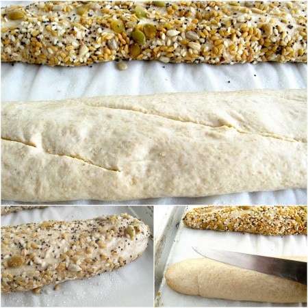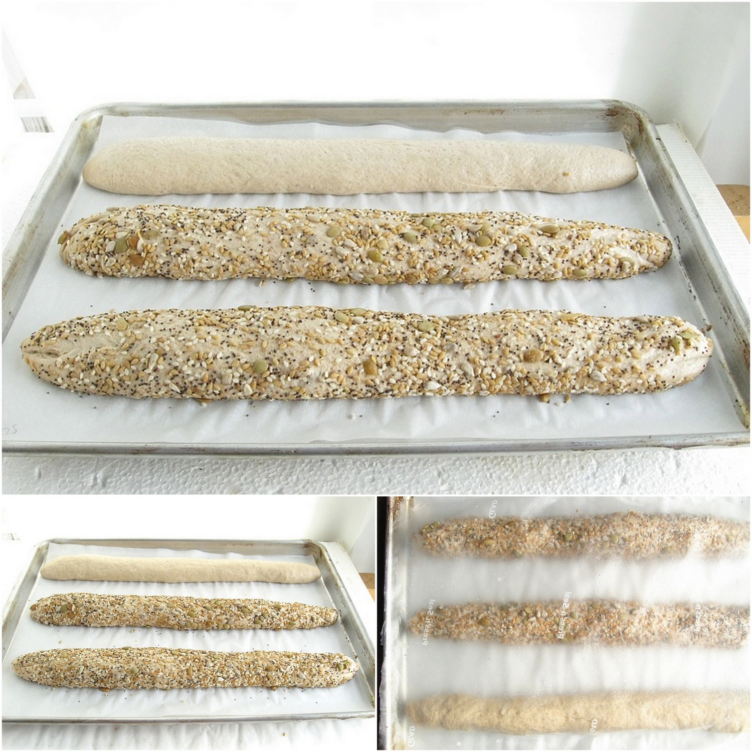 To add seeds, spritz the loaf with warm water, and sprinkle heavily with seeds. For complete coverage, top and bottom, sprinkle some seeds on your work surface, and roll the baguette back and forth through the seeds.