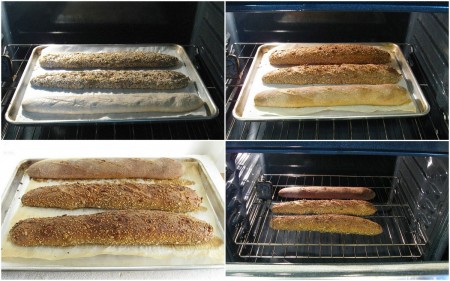 Remove the baguettes from the oven. Turn the oven off, crack it open a couple of inches, and place the baguettes on the oven rack (without the pan) to cool; this will increase their crisp crustiness.
