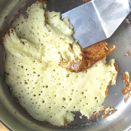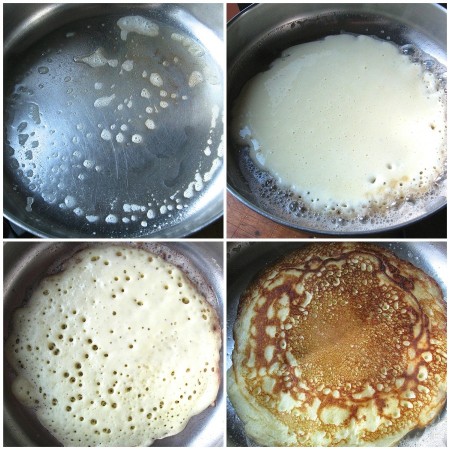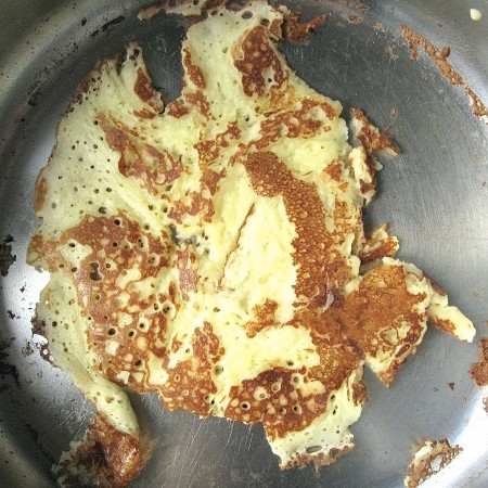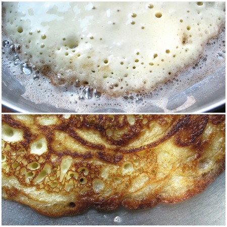 Pour a scant 1/2 cup batter into the pan, tilting the pan until the batter forms a circle about 8" in diameter. It's important that you do this quickly, before the pancake has a chance to set; the thin edges that result from tilting the pan to distribute the batter become wonderfully crispy.