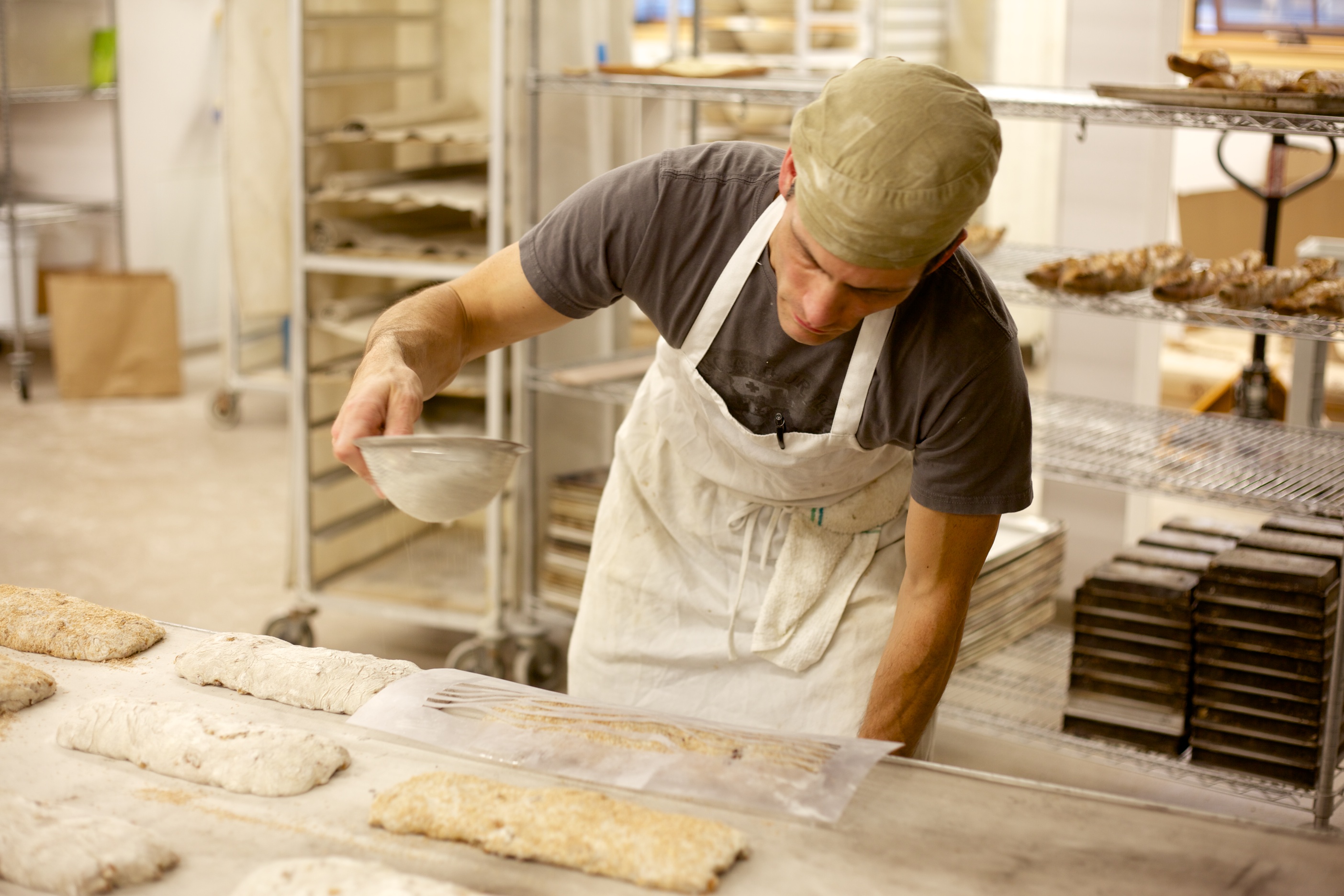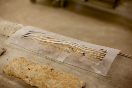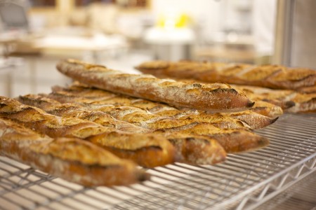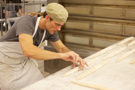 Pictured above, Martin is scoring baguettes made with Type 85 flour. Type 85 is a grade of flour between white and whole wheat; it retains much of the nutrition of whole wheat, but some of the bran has been sifted out to achieve lighter products.