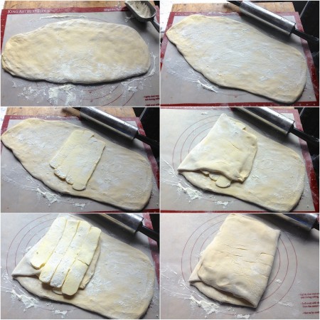 Remove the dough from the fridge, and again roll it into a rectangle about 10" x 24". Fold it into a packet as you did before; it'll be about 7" x 12". Give it another short rest in the fridge.