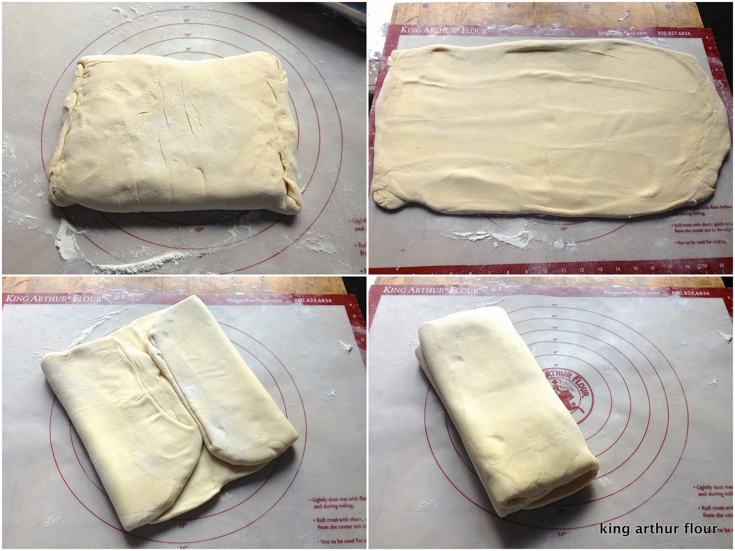 Turn the dough 90°, so a 12" side is closest to you. Roll the dough into a 10" x 24" rectangle (approximately). Fold each side into the center; then fold one side over the other to make a rectangular packet about 6" x 10".