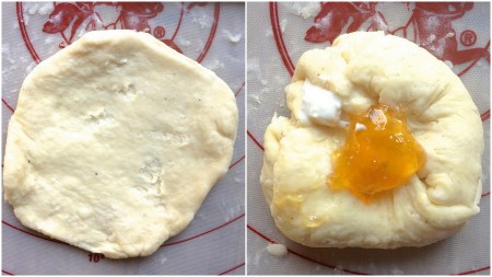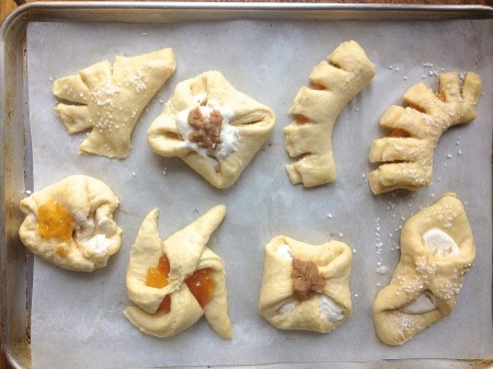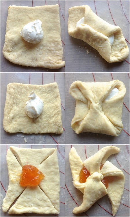 Dollop a heaping measuring teaspoon of filling into the center of each square of pastry. Shape as shown above, squeezing the edges of the dough together where they meet in the center.