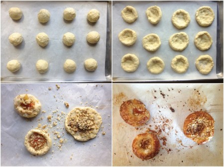 Note: As you can see in the photo above (bottom row, left), at the last moment I decided to take one of the risen rounds and simply flatten it, leaving the edges just slightly puffy. I spread filling across the center of the disk, creating a circle of filling about 2" in diameter. Then I scattered crushed walnuts over the filling.