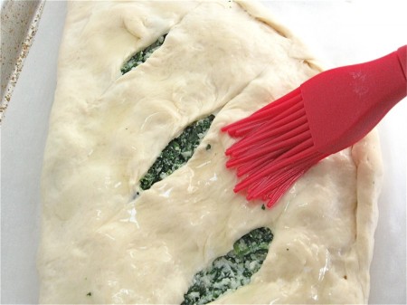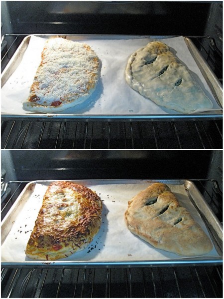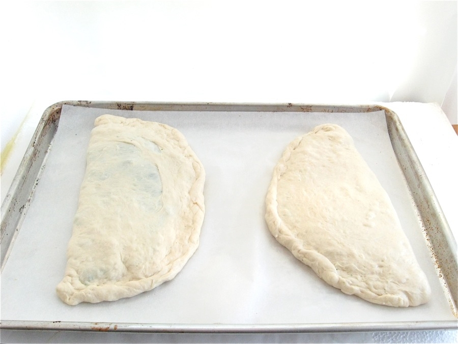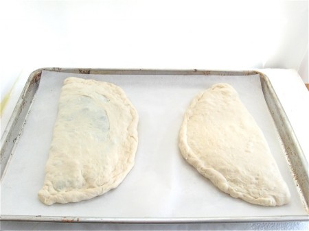 Cut 3 or 4 slits in the top of each calzone, to allow steam to escape. Brush with olive oil.
