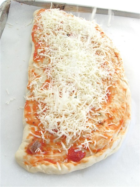 A calzone is nothing so much as a thin-crust pizza topped on only half its surface, then folded over on itself. The fillings are sealed inside; the folded-over pizza – a.k.a. calzone – bakes up golden brown; and its top-and-bottom crust safely contains all the delicious (and messy) topping ingredients, which have now become filling.