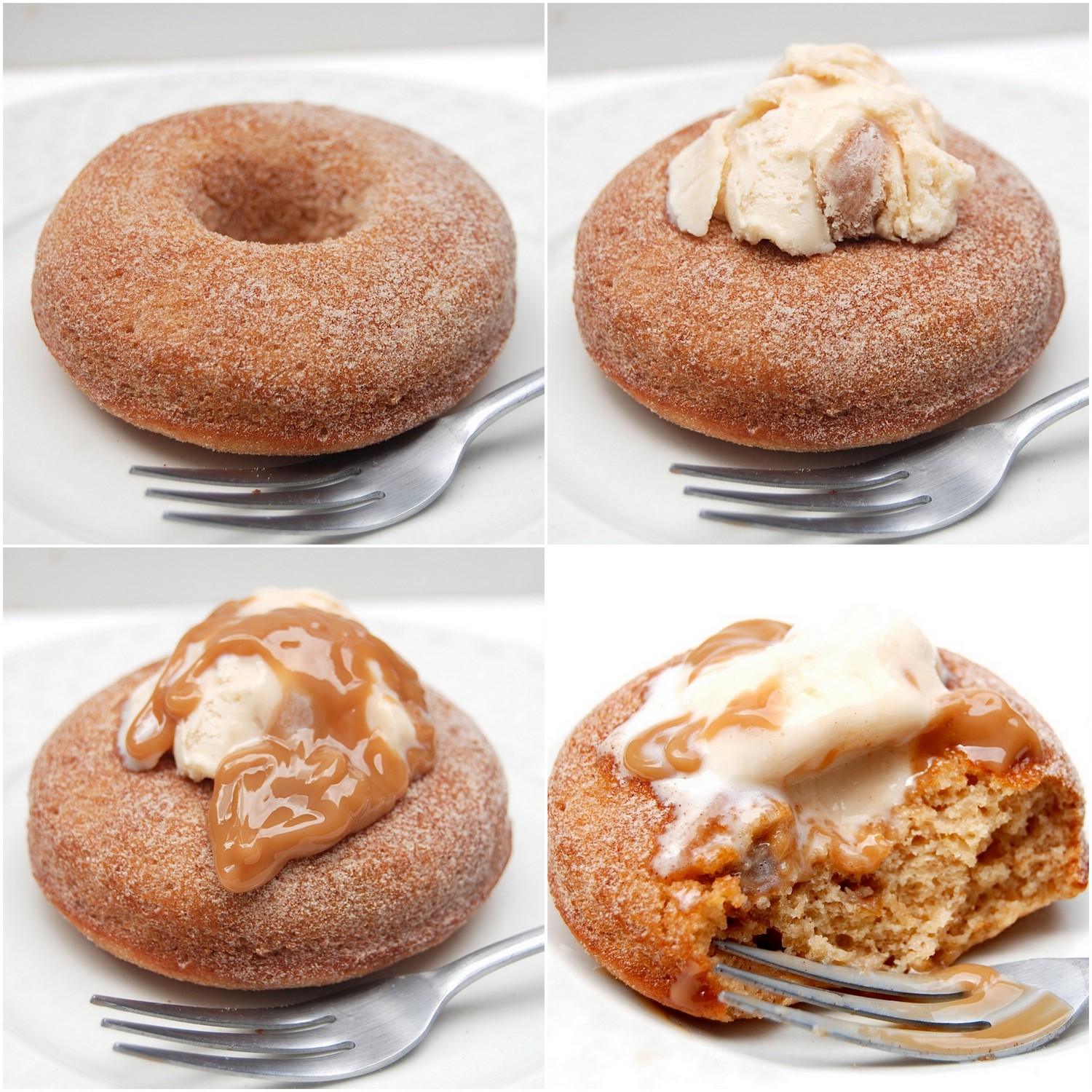 Here I'm filling a warm apple doughnut with caramel-swirl ice cream, and topping it with butterscotch sauce. Warm cake, soft ice cream, unctuous sauce...
