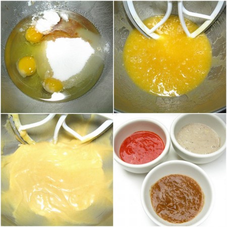 Now, usually I'd beat in fruit purée (applesauce, mashed bananas, puréed strawberries) along with these other ingredients. But this time, I wanted to test three different flavors at once – so I made the batter, divided it into three portions, and added a little less than 1/2 cup purée to each portion.