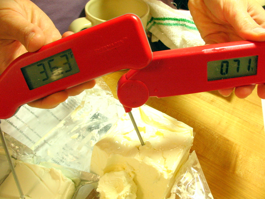 There's a huge difference in temperature, not to mention texture, between cream cheese straight from the fridge and cream cheese that's been at room temperature for an hour.