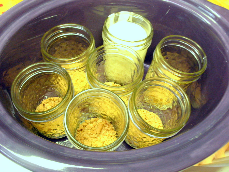 Place the jars in a 7- to 8-quart slow cooker. Can you see the messy jar I filled up in the back? Do try to be a little neater than I was.