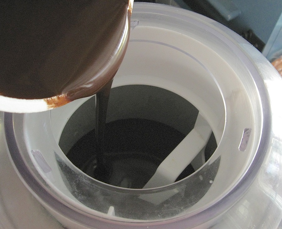 Start making the sorbet at least 4 hours before you want to serve it. Pour the chocolate into the freezer bowl of your ice cream maker, and freeze for 25 minutes or so.