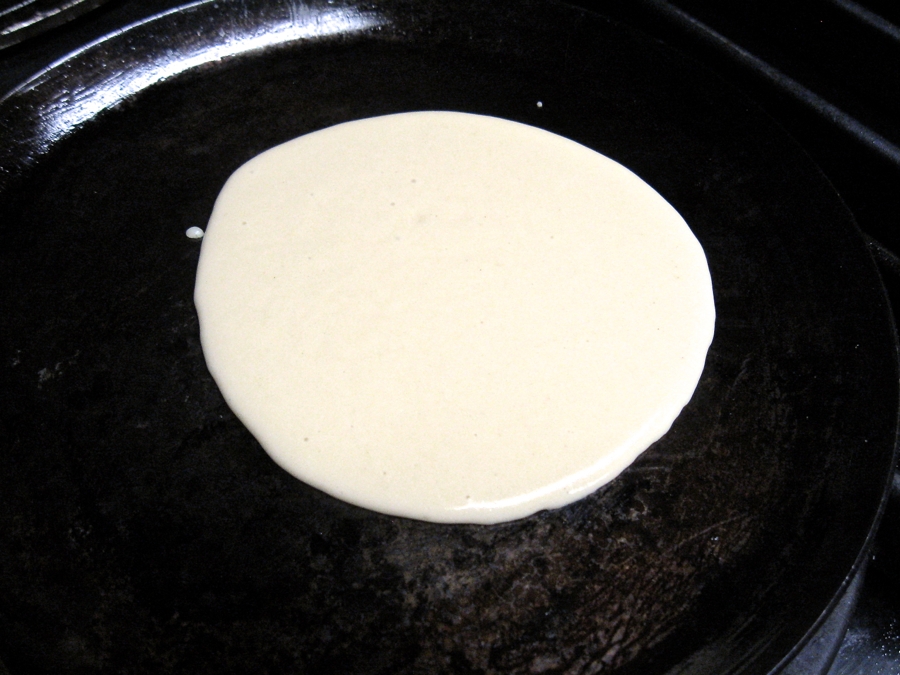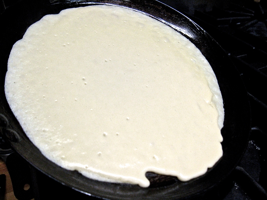 Immediately pick the pan up and tilt it in a circular motion, so the batter covers the bottom surface.