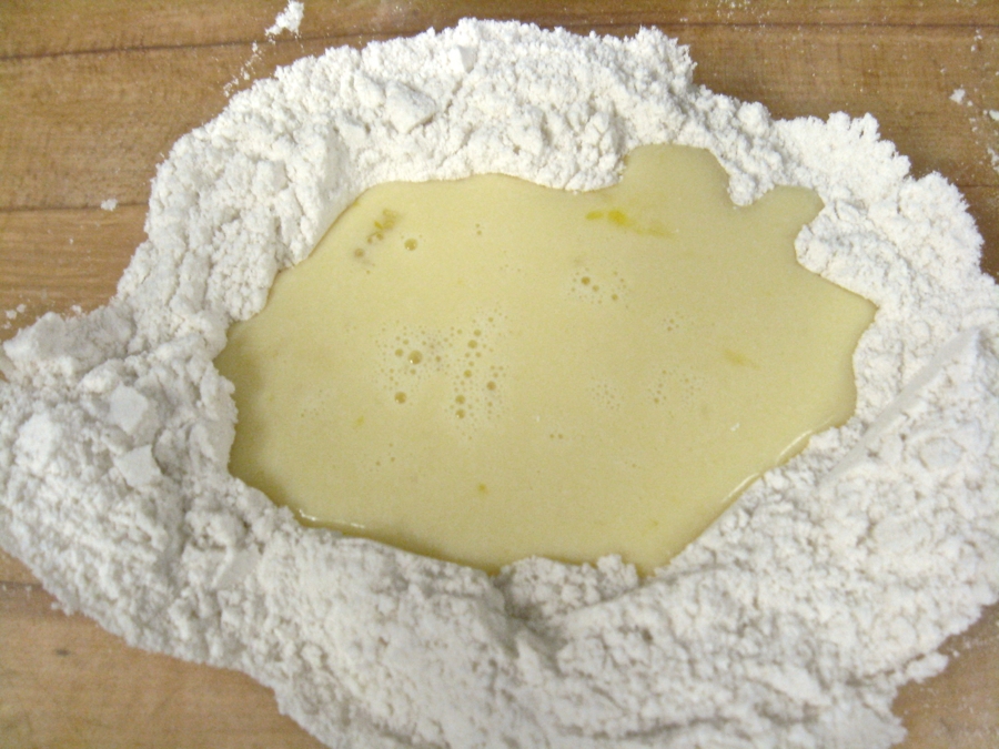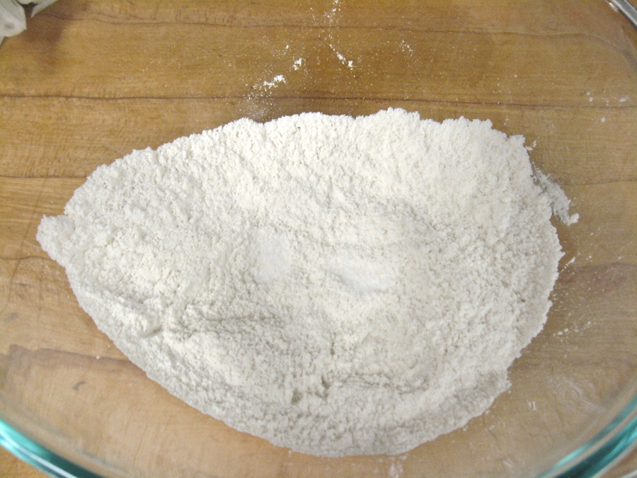 Make a shallow well in the flour mixture and pour in about half the liquid.