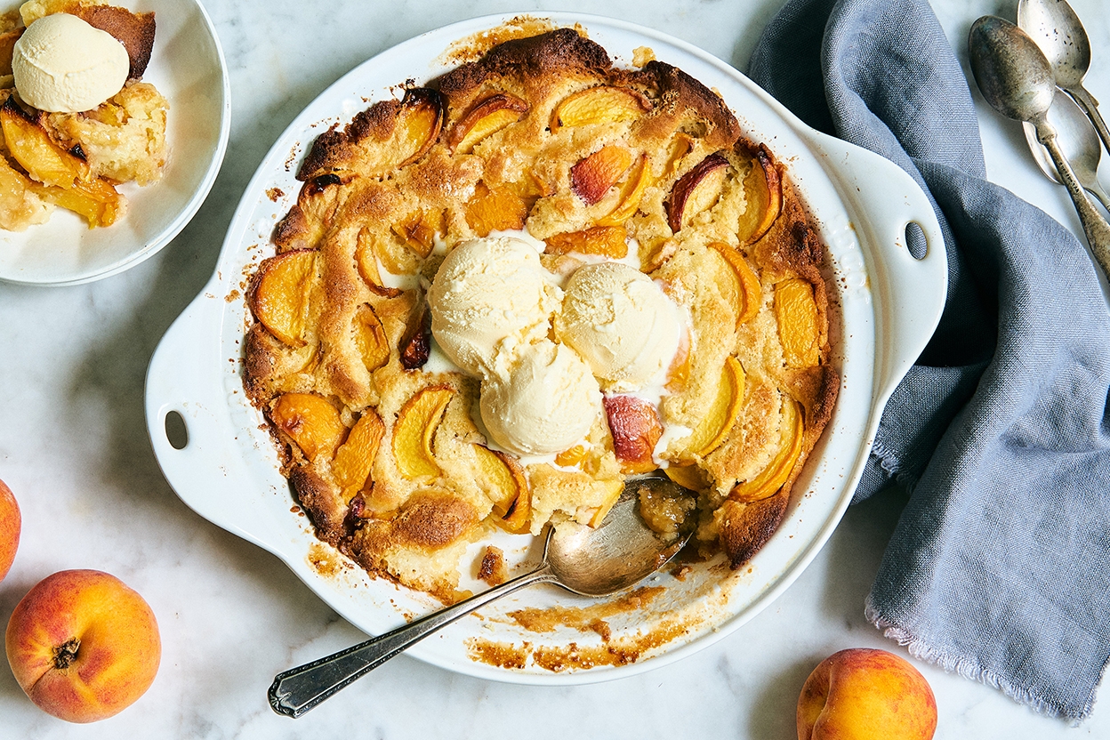 If you're making this dessert outside of peach season, though, you'll need to thaw frozen fruit completely, draining any excess liquid.