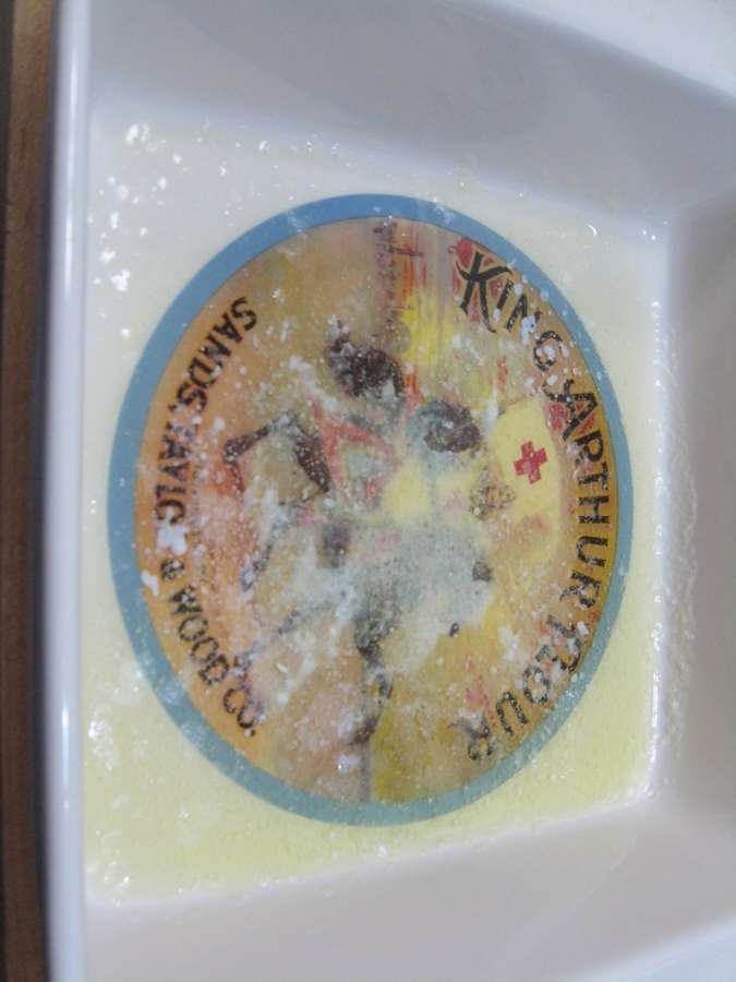 Melt 4 tablespoons (57g) butter in the bottom of an 8" square or 9" round baking pan. I conveniently threw mine into the preheating oven!