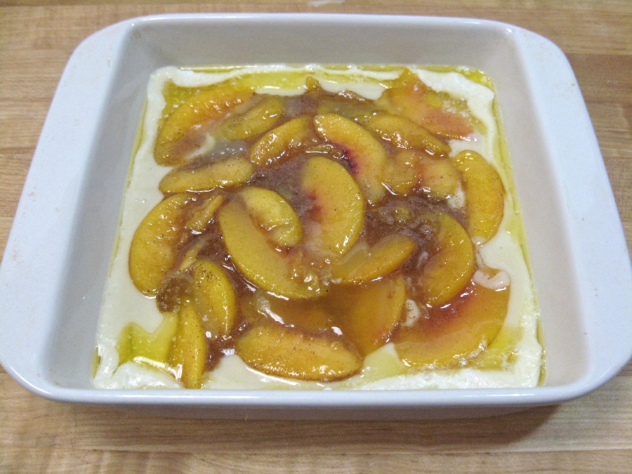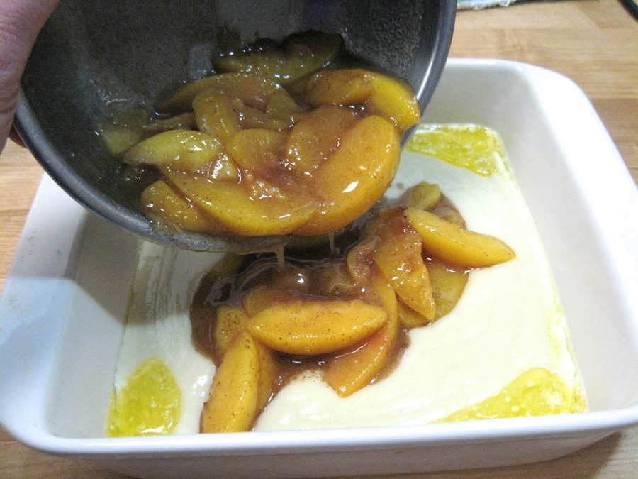 Pour the batter into the prepared pan, followed by the peaches