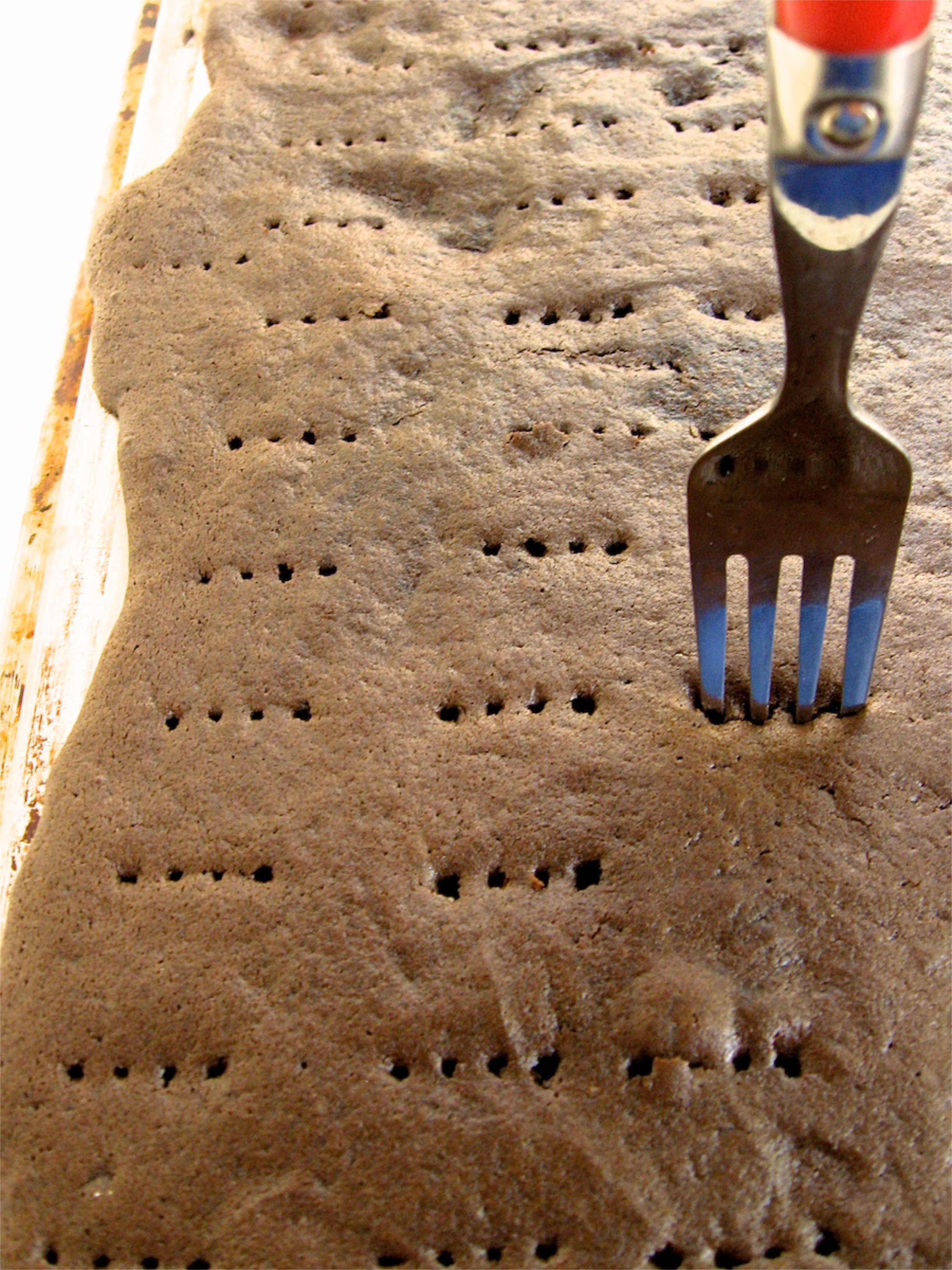 Use a fork to prick the top of the cookie slabs in neat rows, like the top of a traditional ice cream sandwich.