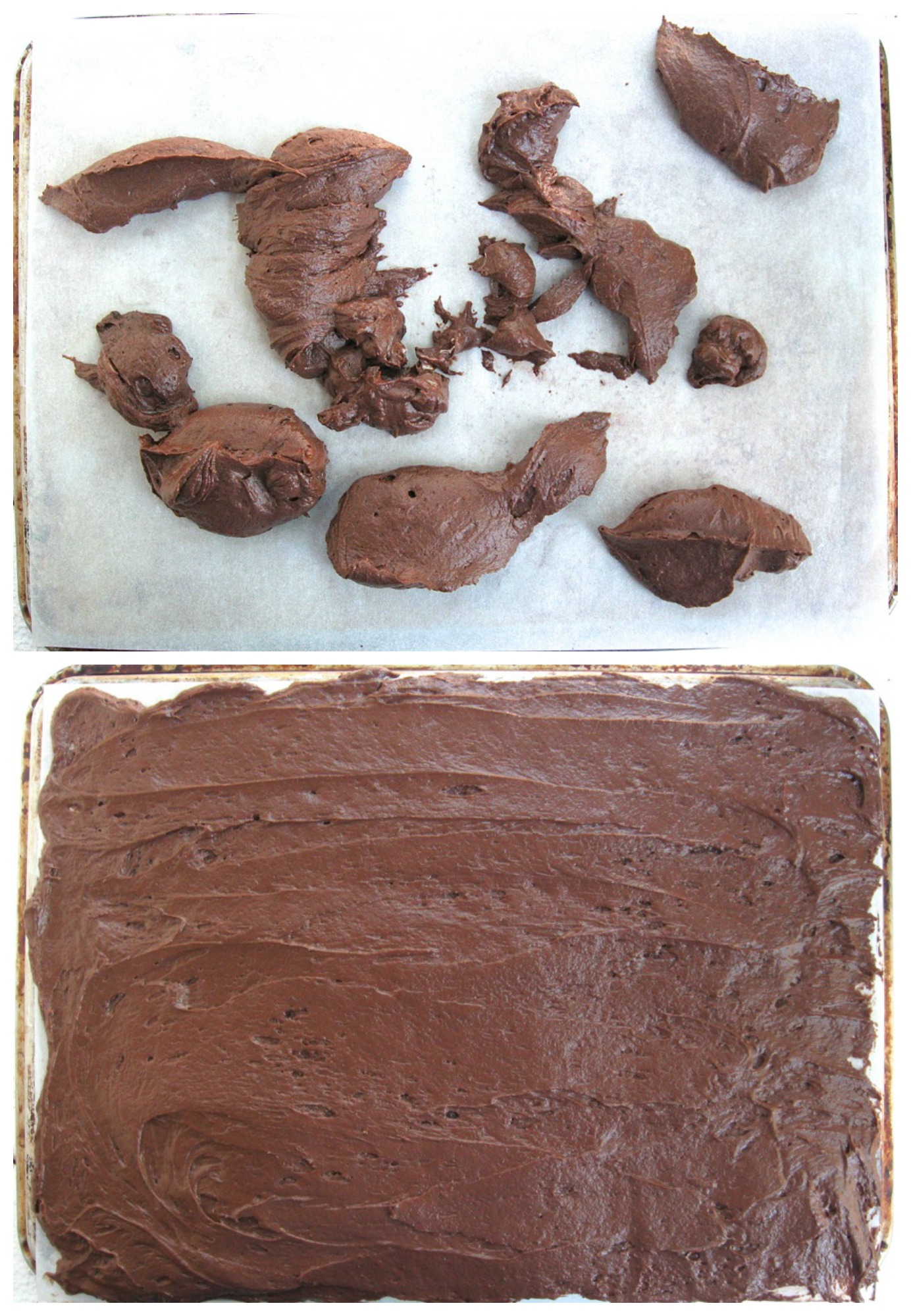 Dollop the batter all over the prepared parchment paper. Use a spatula to spread it to the edges of the parchment, smoothing it as flat as possible.