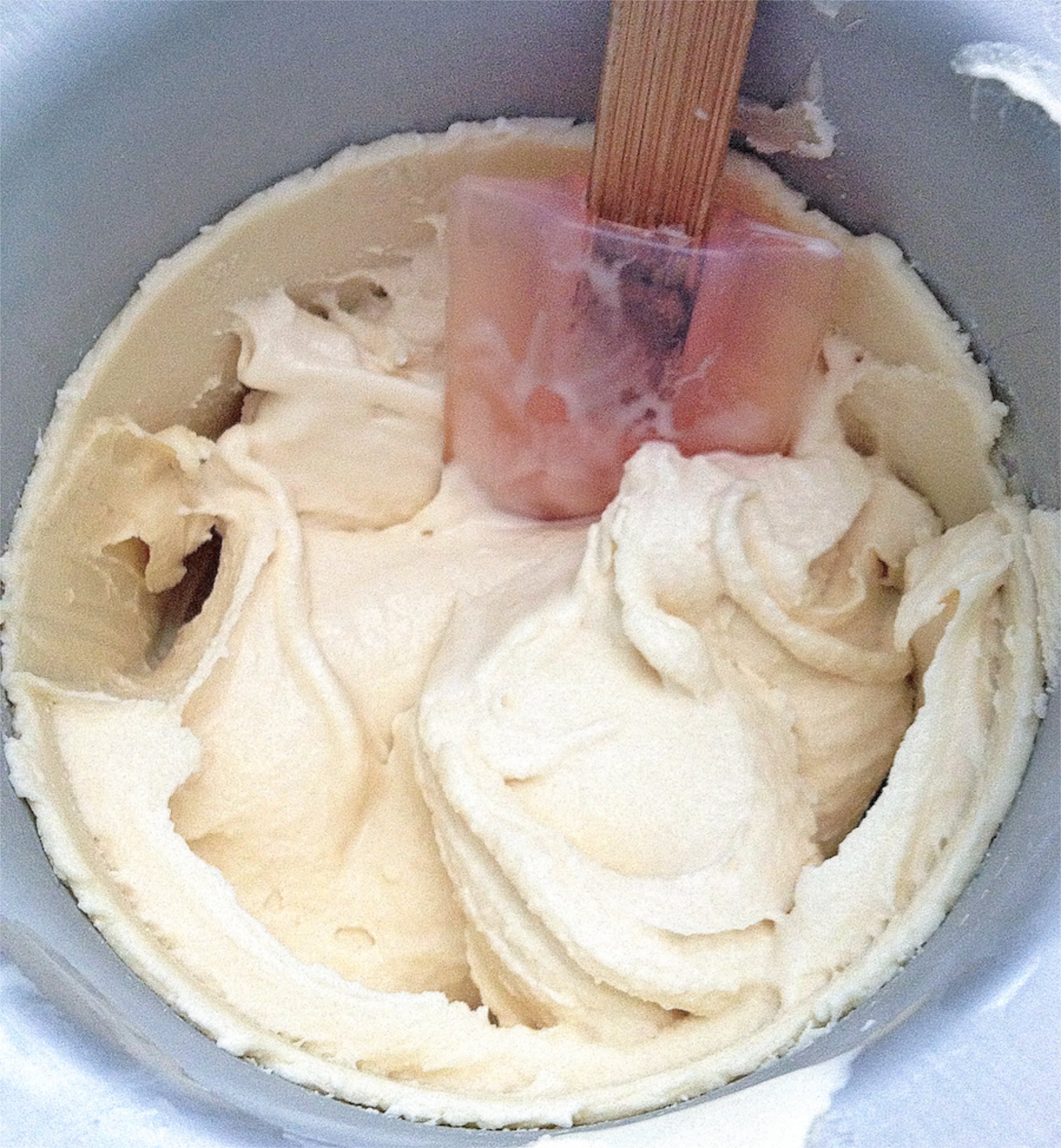 Beat at high speed until well combined and somewhat expanded; the mixture will look a bit grainy, but also fairly creamy.