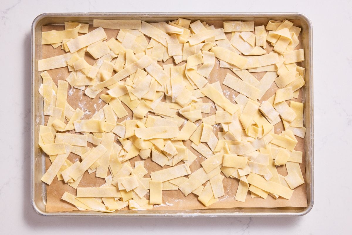 Egg noodles are exactly what they sound like — noodles made from an egg-based dough. We also include salt for flavor and baking powder for texture — egg noodles tend to be a little lighter in texture than regular pasta, and it's baking powder that gives them that boost — plus we use milk for added richness. The dough can be made entirely in a food processor, and you can roll it with pasta machine or by hand, depending on what you have on hand.