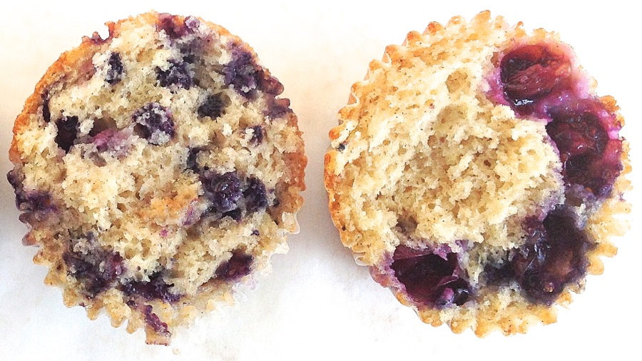A blueberry muffin made with 100% whole wheat flour on the left. And on the right, the same muffin made with all-purpose flour.