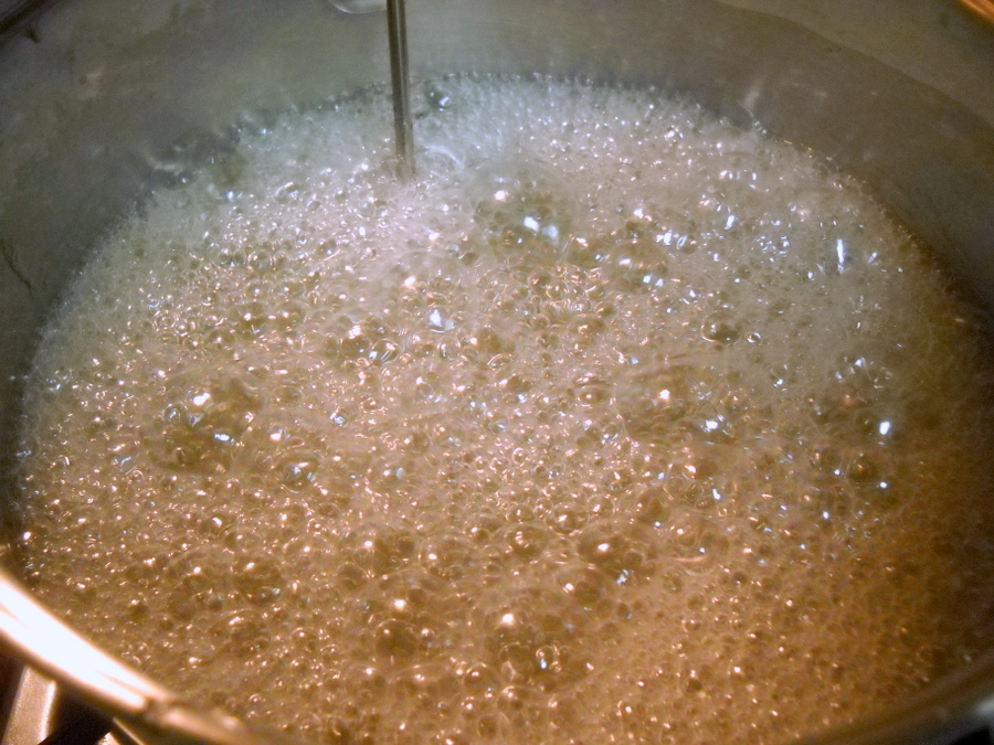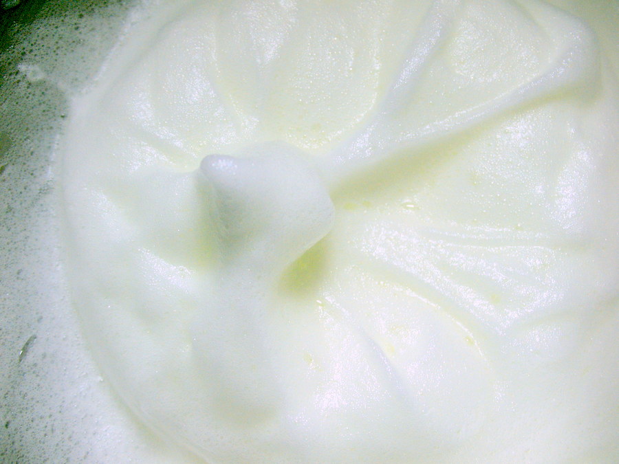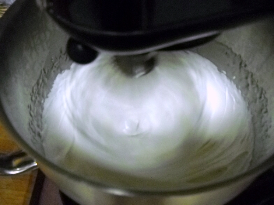 By now the sugar syrup should be at 240°F. With the mixer running, slowly pour a steady stream of syrup along the inside of the bowl. The whites will deflate somewhat as the hot syrup hits, but keep whipping.