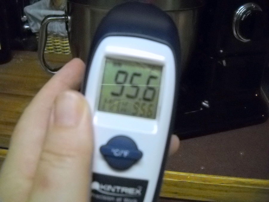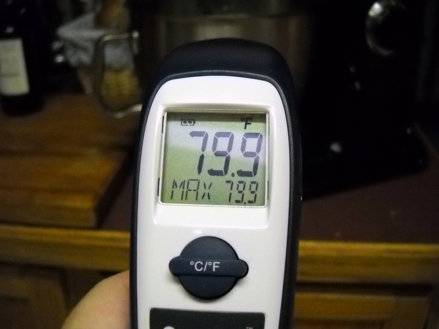 Take good care as the bowl is quite hot at this stage. I borrowed my husband's handy dandy infrared thermometer to check the temperature. Sorry for the blur, but it's pretty darn hard to hold both this and the camera steady at one time.