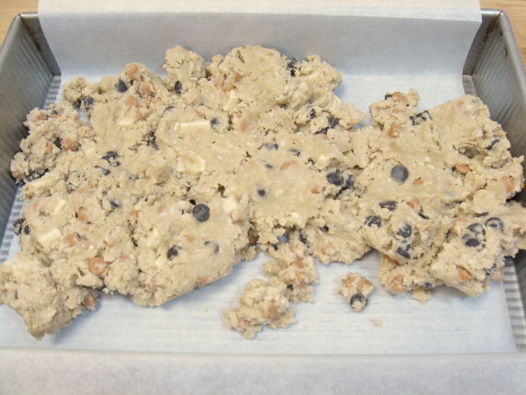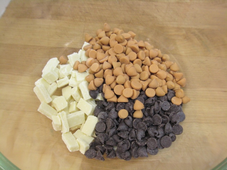 Add 3 cups of chips, nuts, oats, or dried fruit. I chose 1/2 cup each butterscotch chips, chocolate chips, and white chocolate chunks.